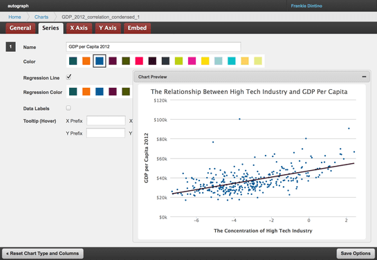 That fall I turned my prototype into “Autograph,” a Django application for managing datasets, performing basic regression analysis, and building customized charts. While Autograph itself is not open-source several of its components are, including py4j-highcharts, a Java application that renders and rasterizes charts server-side for building previews and thumbnails. py4j-highcharts uses py4j, a library for bridging python and Java applications, to be able to take advantage of Java libraries such as Rhino and Batik.