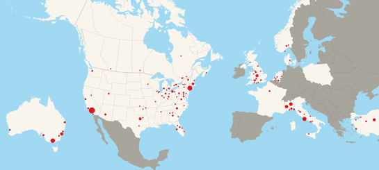 Parts from the F-35 are sourced from over 250 locations around the globe, spanning 11 countries and, in the U.S., more than 90 congressional districts. Hover over any red dot to see a list of contractors.