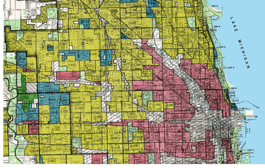 A 1939 Home Owners’ Loan Corporation “Residential Security Map” of Chicago shows discrimination against low-income and minority neighborhoods. The residents of the areas marked in red (representing “hazardous” real-estate markets) were denied FHA-backed mortgages.